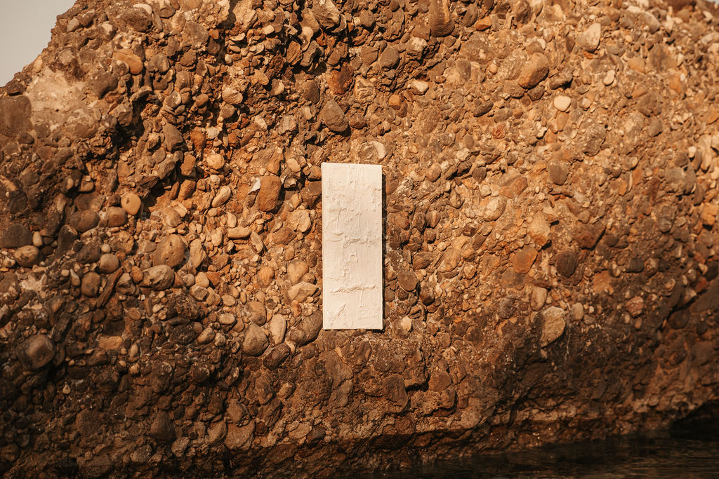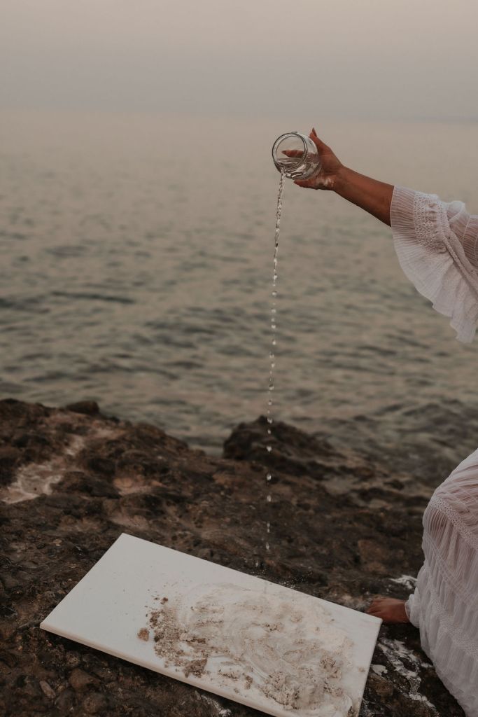 All’utilizzo di gessi ed argille, si affiancano elementi naturali la cui scala cromatica spazia dalla graduazione di toni del bianco verso cromie più sabbiose e di terra. Tali preferenze derivano dai territori che quotidianamente “pratica” e da cui trae ispirazione: la costa dove spende ore in silenzio, all’ascolto delle onde che si riversano impetuose e sulle rocce o sulla battigia; l’habitat marino che non cessa di concederle stimoli e che nel tempo ha visto cambiare e ridisegnare il paesaggio.